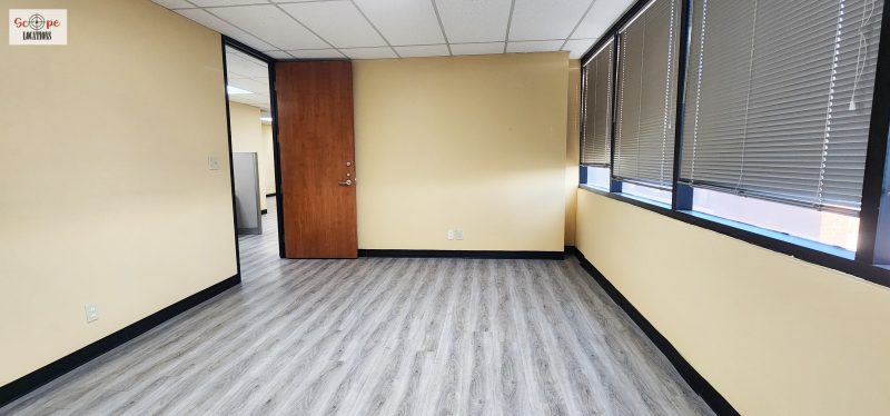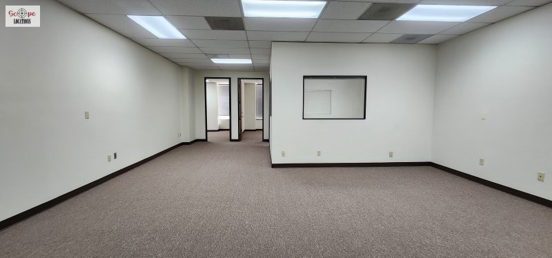As you enter the building through the large glass arched entryway spanning the height of all three floors, you’re welcomed into a long corridor where you can access multiple offices. The vacant offices on multiple floors present a range of unique settings to suit your filming needs.