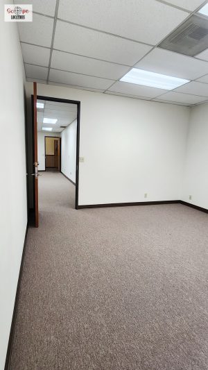 The first-floor vacant office features off-white walls and commercial grade brown office carpeting, creating a neutral canvas that adapts to diverse scenes. On the second floor, a different ambiance awaits with yellow walls and tastefully tiled floors, adding a touch of vibrancy to the surroundings.