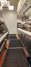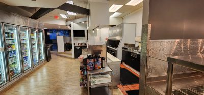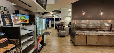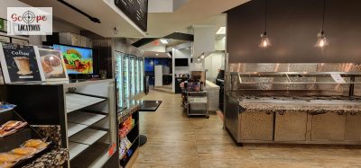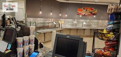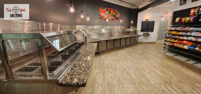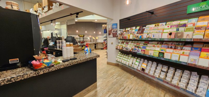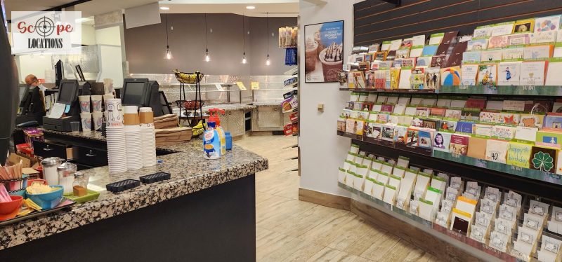 Upon entry, the right side features a captivating greeting card display wall and a well-organized check-out counter. The focal point of the interior is a large wrap-around stainless steel buffet food serving counter, illuminated by pendant lighting. Beyond the buffet, a wall of glass beverage refrigerators adds to the visual appeal.