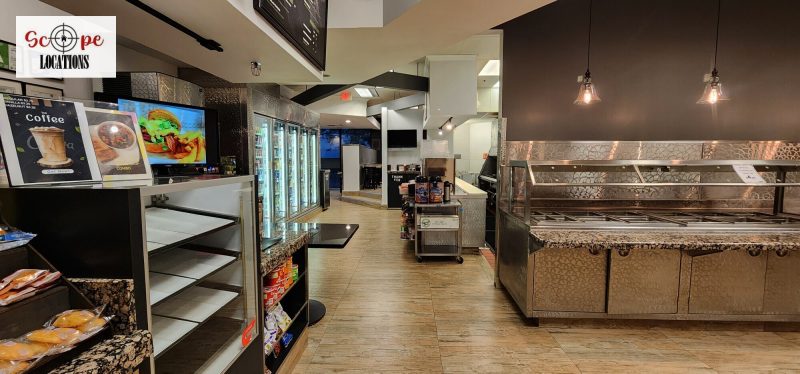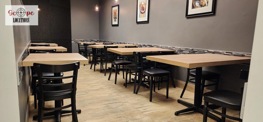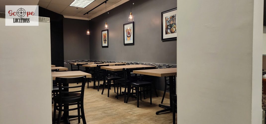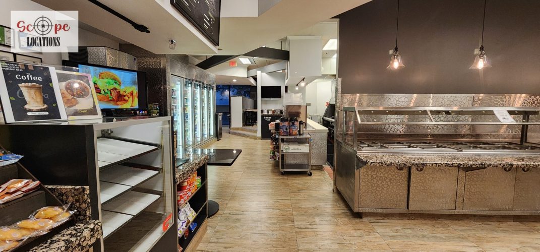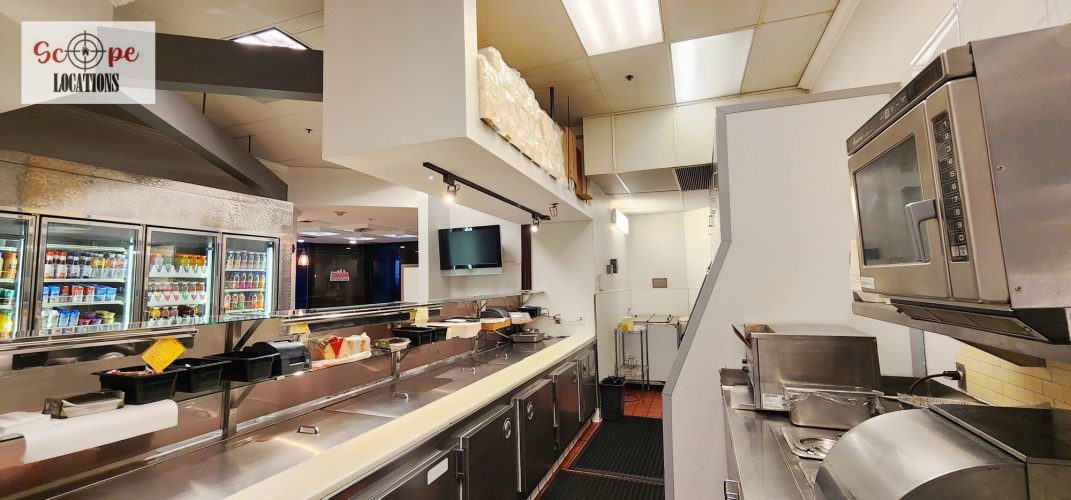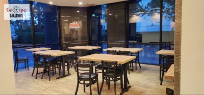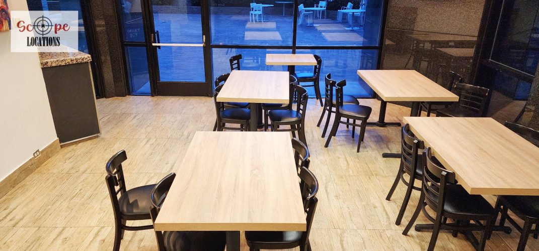 This versatile filming location seamlessly blends modern aesthetics with functionality, offering a dynamic backdrop for a range of creative projects set within the ambiance of a bustling cafe/restaurant in a corporate setting.