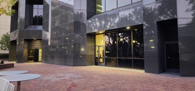 Explore the cinematic potential of this cafe/restaurant situated within a spacious office building. The exterior boasts a sleek and modern design with a glossy black tile facade and inviting brick flooring.