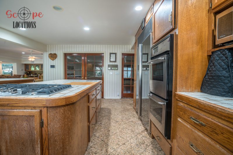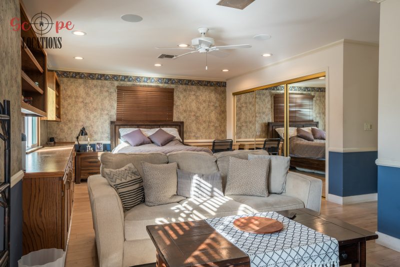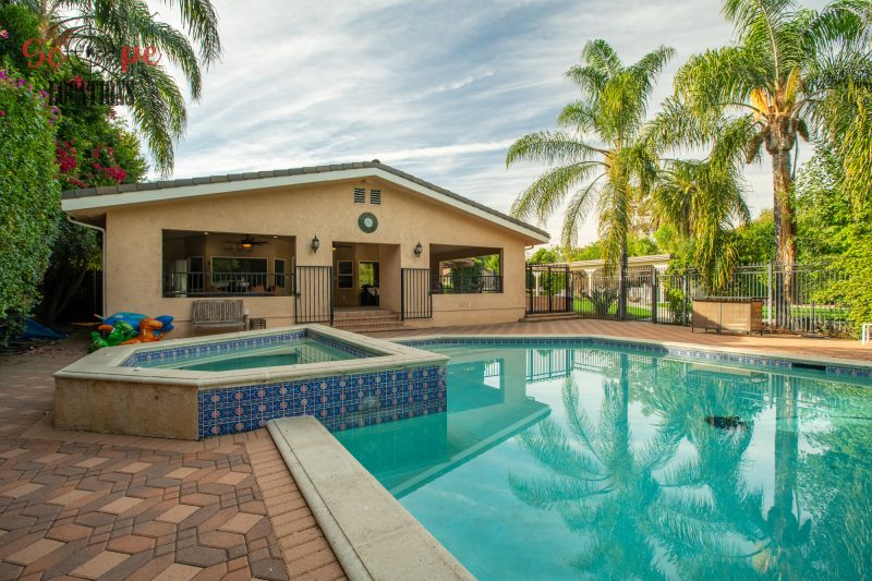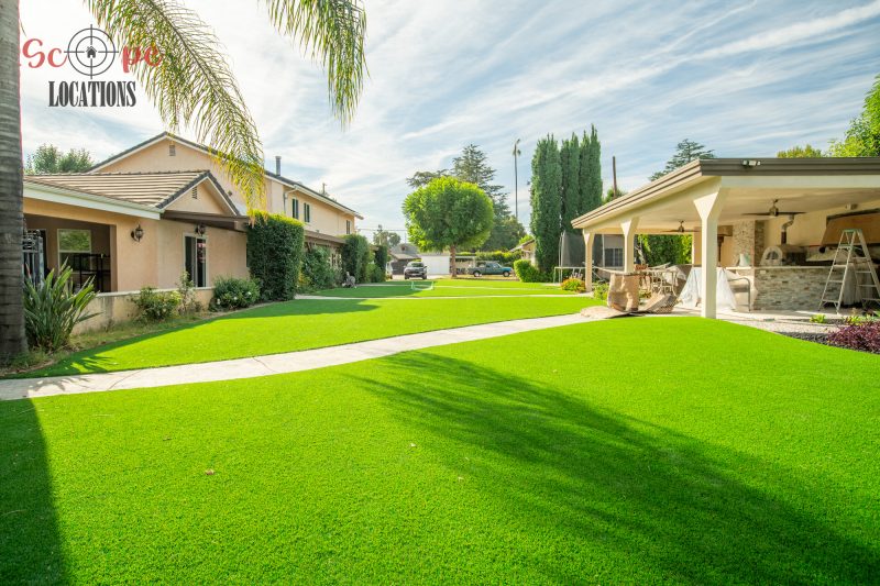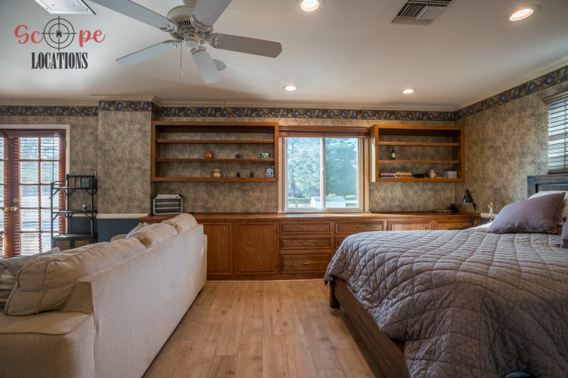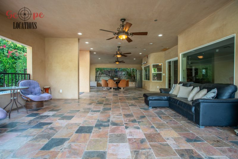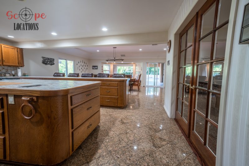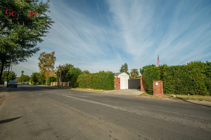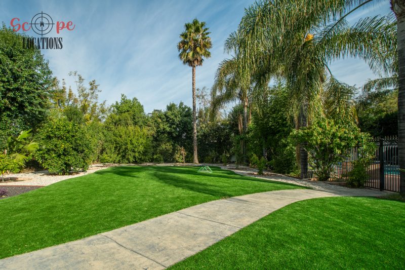 The outdoor space is a filmmaker’s haven, offering a brand-new covered built-in BBQ and kitchen, a resort-like pool, a separate guest house, a driveway with parking for over a dozen vehicles, and a wrap-around trellis. An adjacent lot with a small home adds further flexibility to meet your filming needs, making this location an epitome of versatility and grandeur.