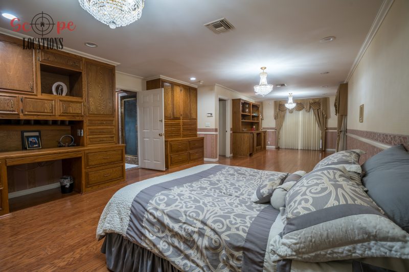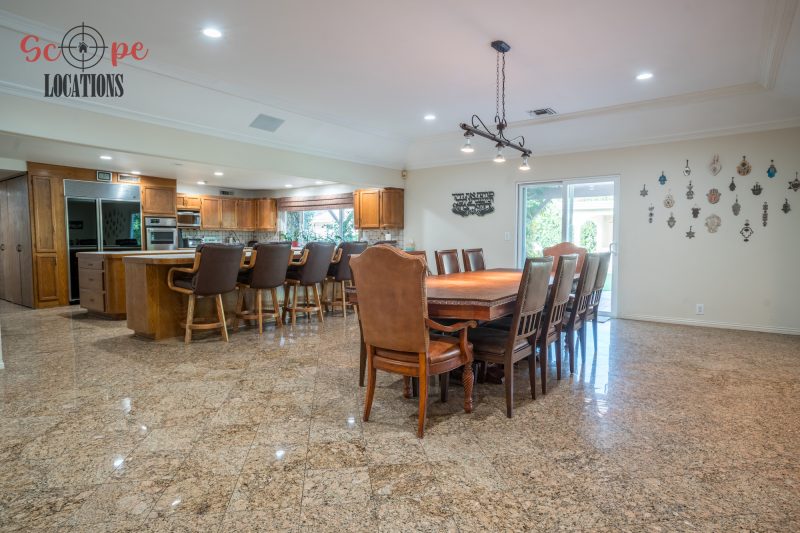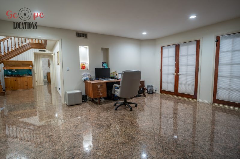 Step into this vast 5,000 sq ft gated home on 36,000 sf of flat land, offering an ideal canvas for your upcoming filming project. The interior unfolds with a study/office/library boasting walnut wooden cabinets, a fireplace, double French doors, and marble-tiled floors—a sophisticated setting for intellectual or intimate scenes. A secluded TV room, complete with its own bathroom and glass interior French doors, caters to characters in search of privacy. The formal dining room, now a billiards room with a crystal chandelier, marble-tiled floors, and floral wallpaper, introduces an elegant touch.