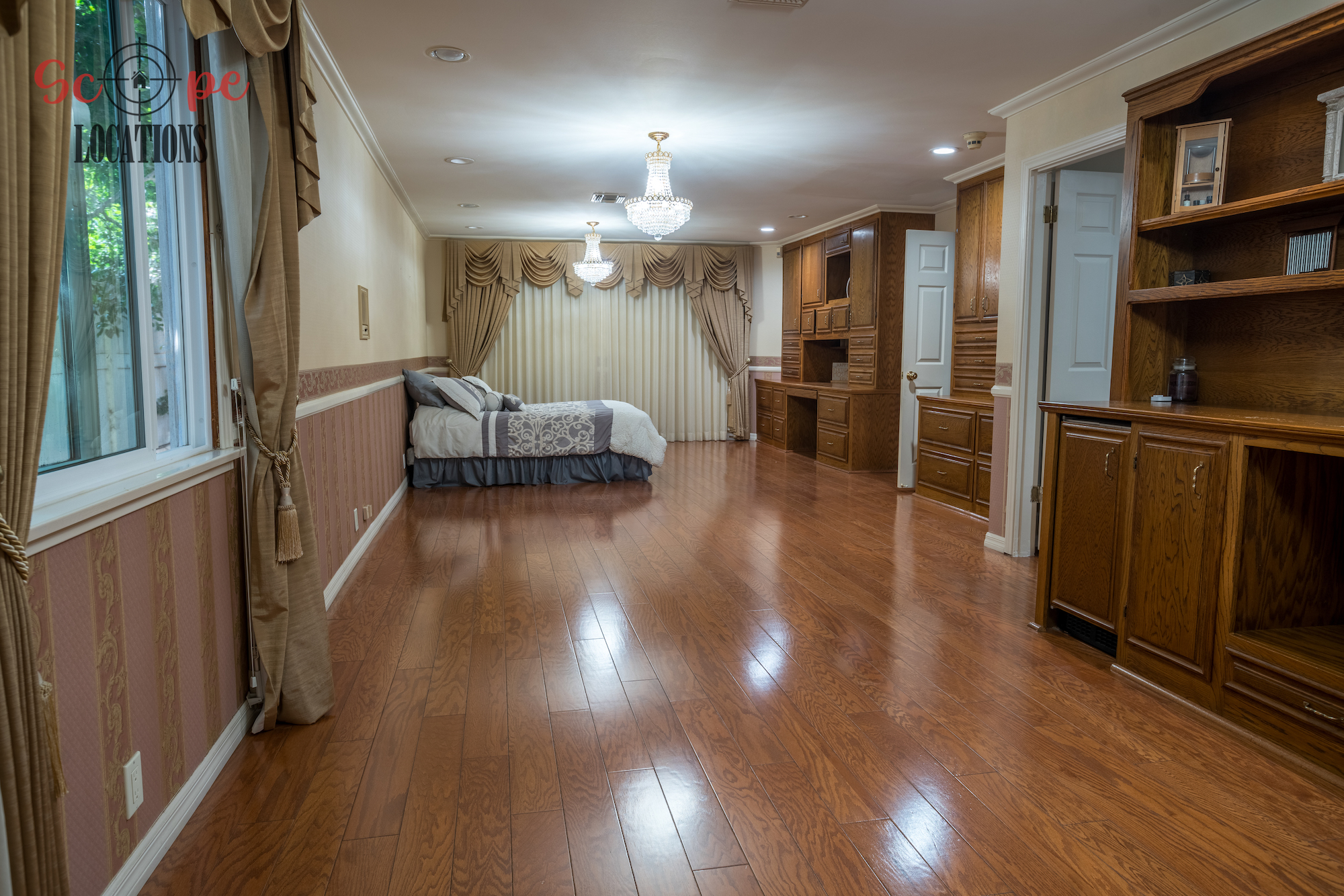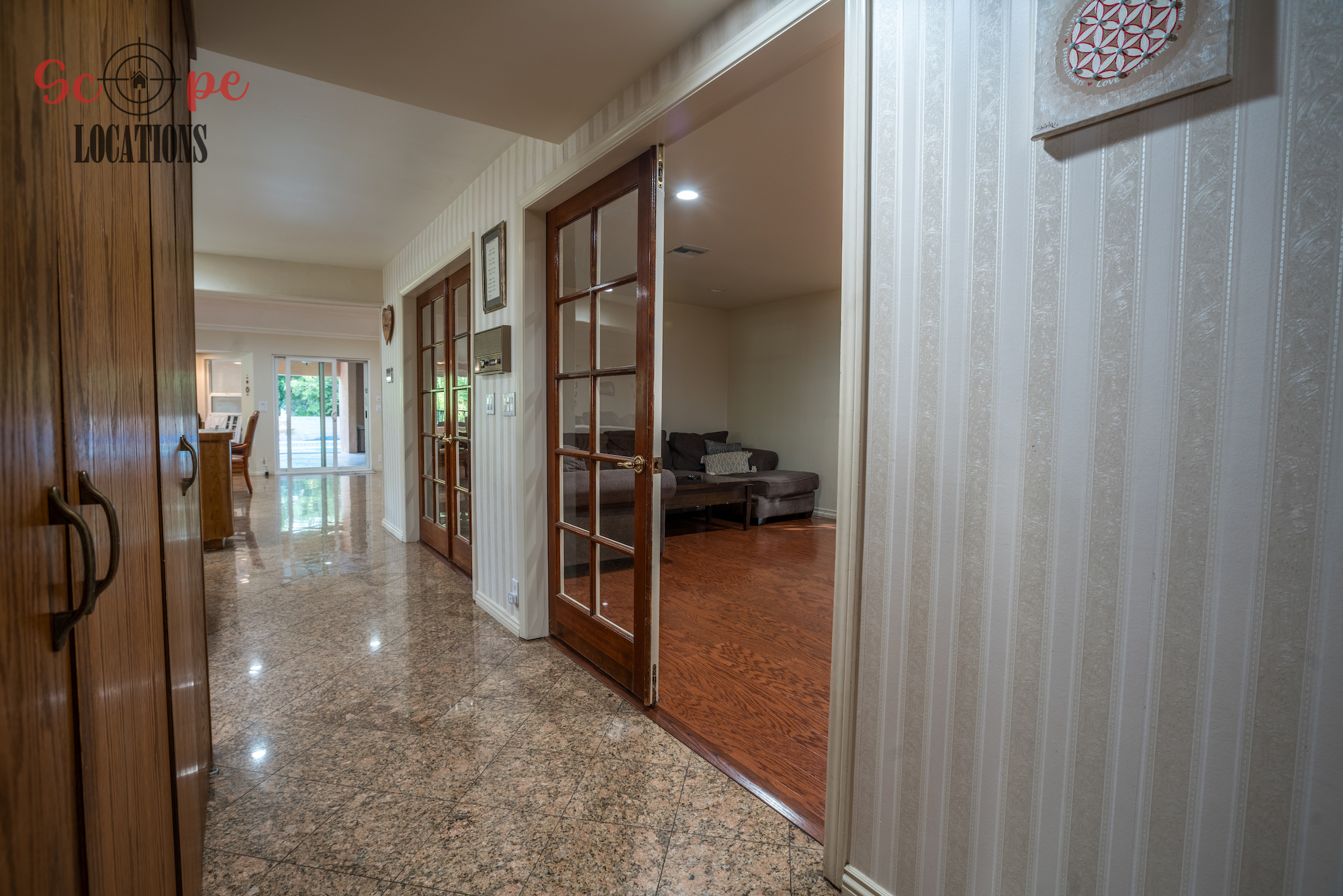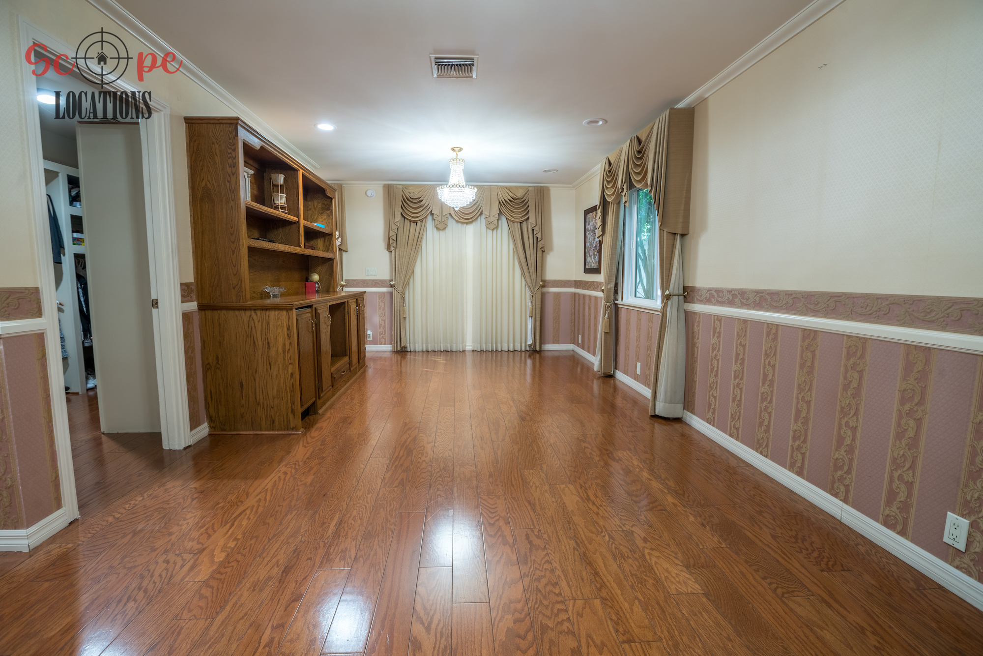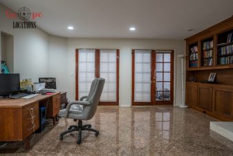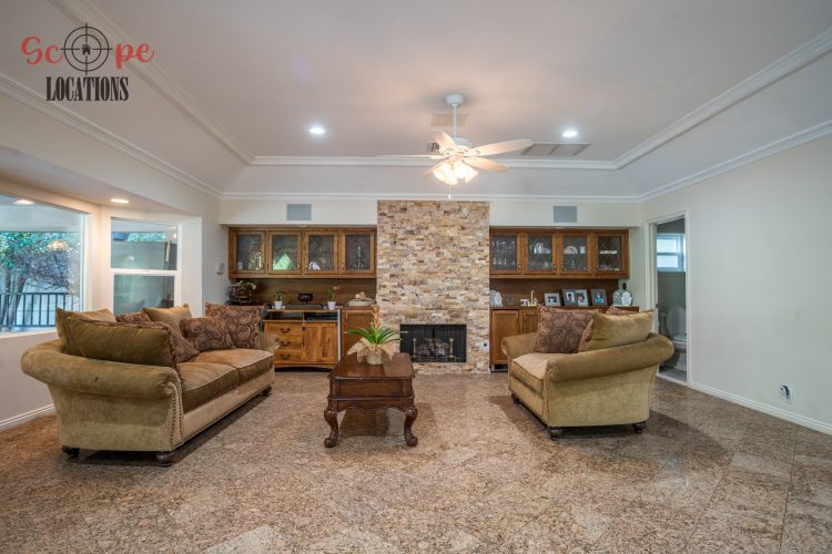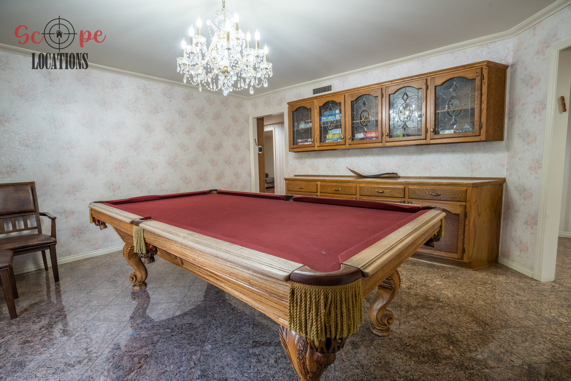 Step into this vast 5,000 sq ft gated home on 36,000 sf of flat land, offering an ideal canvas for your upcoming filming project. The interior unfolds with a study/office/library boasting walnut wooden cabinets, a fireplace, double French doors, and marble-tiled floors—a sophisticated setting for intellectual or intimate scenes. A secluded TV room, complete with its own bathroom and glass interior French doors, caters to characters in search of privacy. The formal dining room, now a billiards room with a crystal chandelier, marble-tiled floors, and floral wallpaper, introduces an elegant touch.