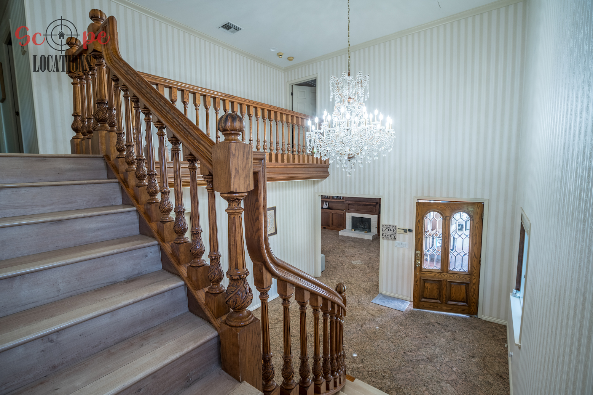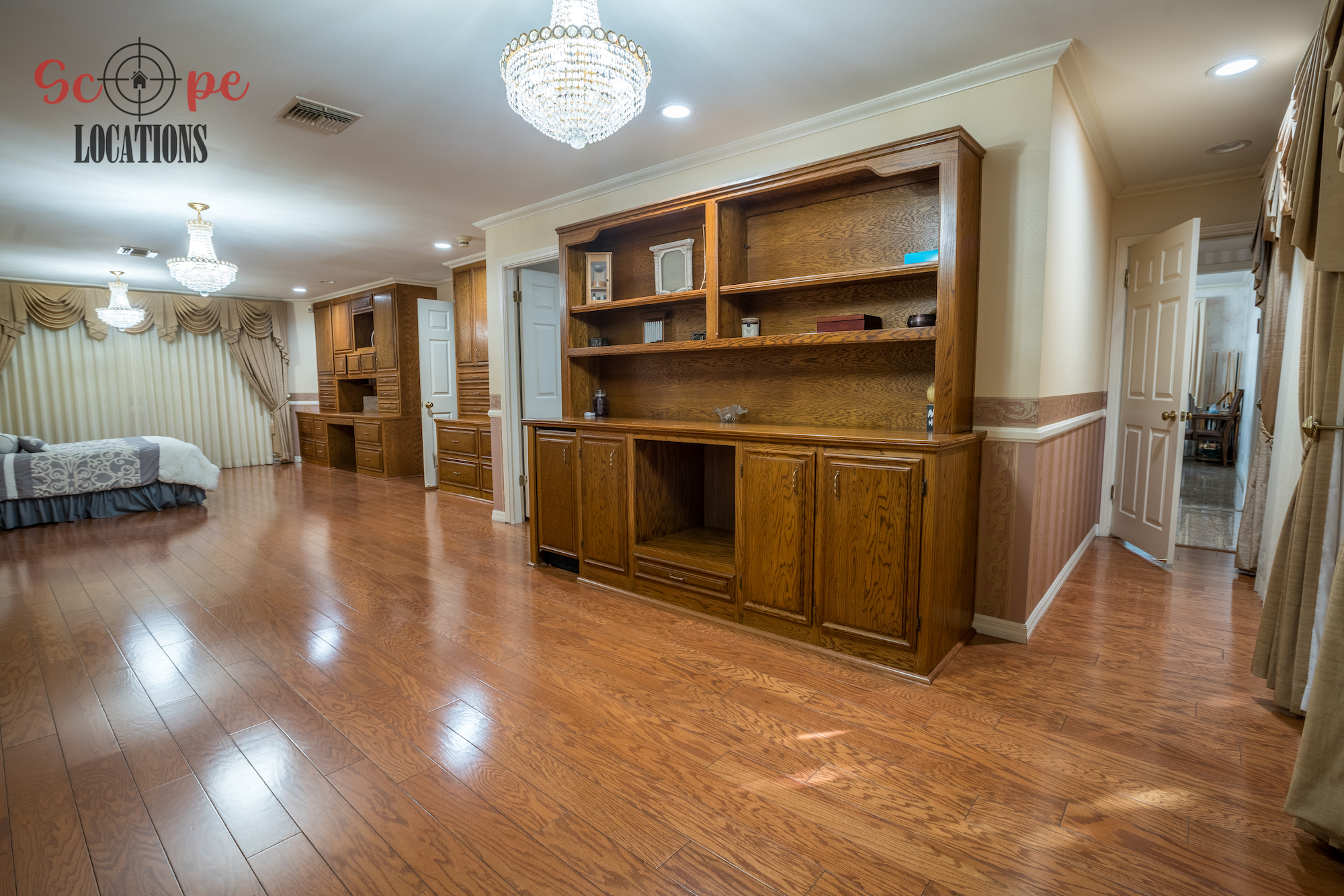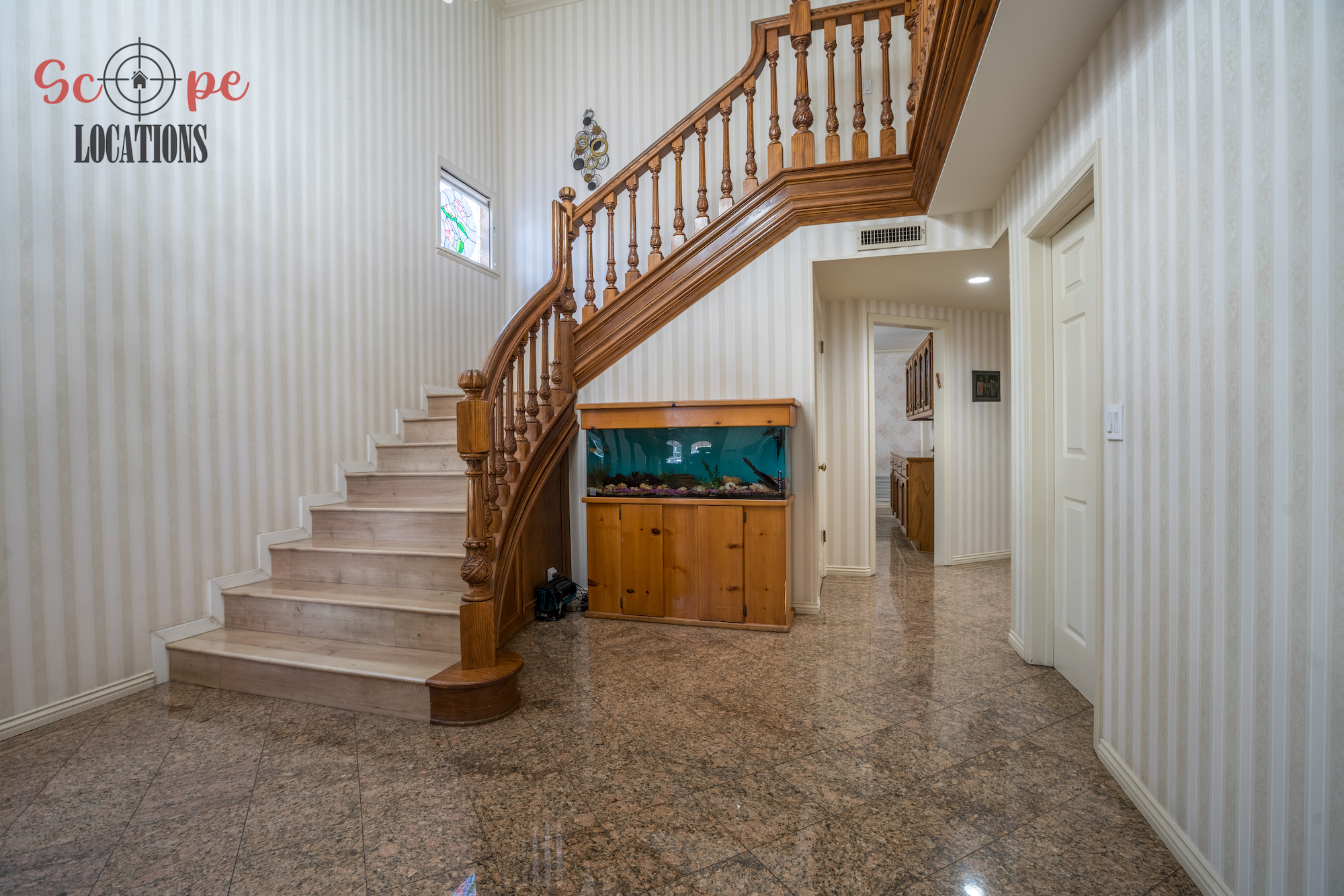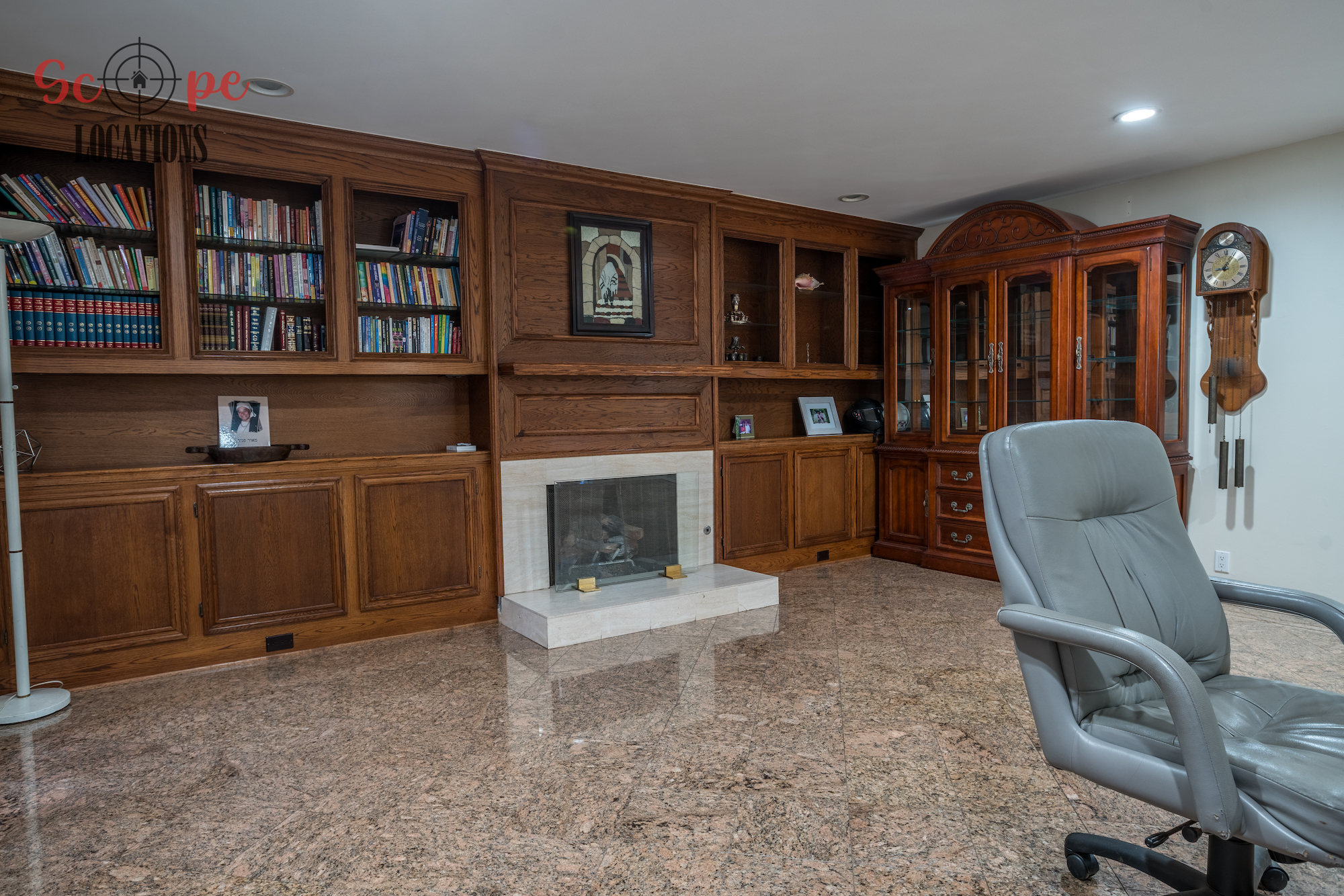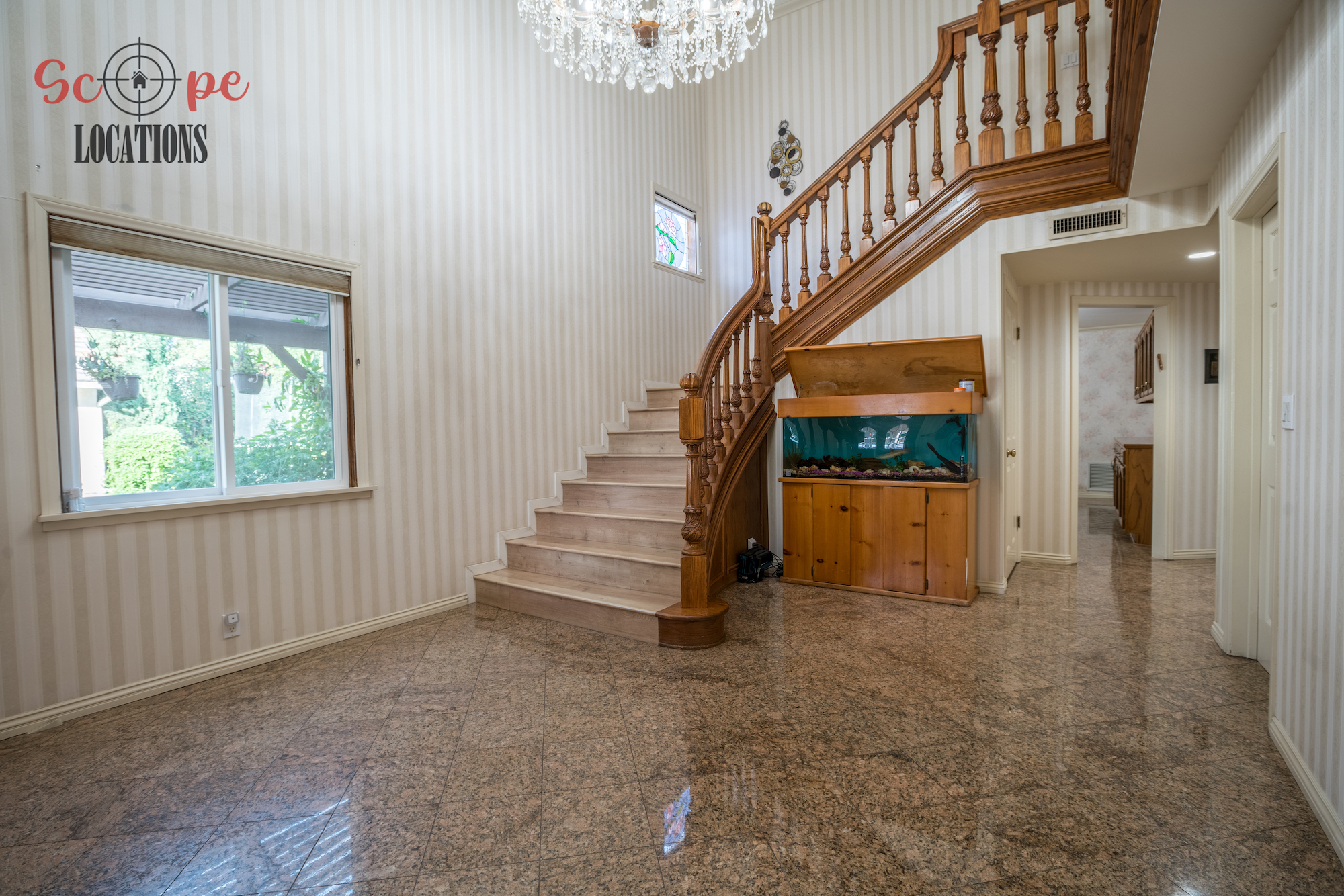 Step into this vast 5,000 sq ft gated home on 36,000 sf of flat land, offering an ideal canvas for your upcoming filming project. The interior unfolds with a study/office/library boasting walnut wooden cabinets, a fireplace, double French doors, and marble-tiled floors—a sophisticated setting for intellectual or intimate scenes. A secluded TV room, complete with its own bathroom and glass interior French doors, caters to characters in search of privacy. The formal dining room, now a billiards room with a crystal chandelier, marble-tiled floors, and floral wallpaper, introduces an elegant touch.