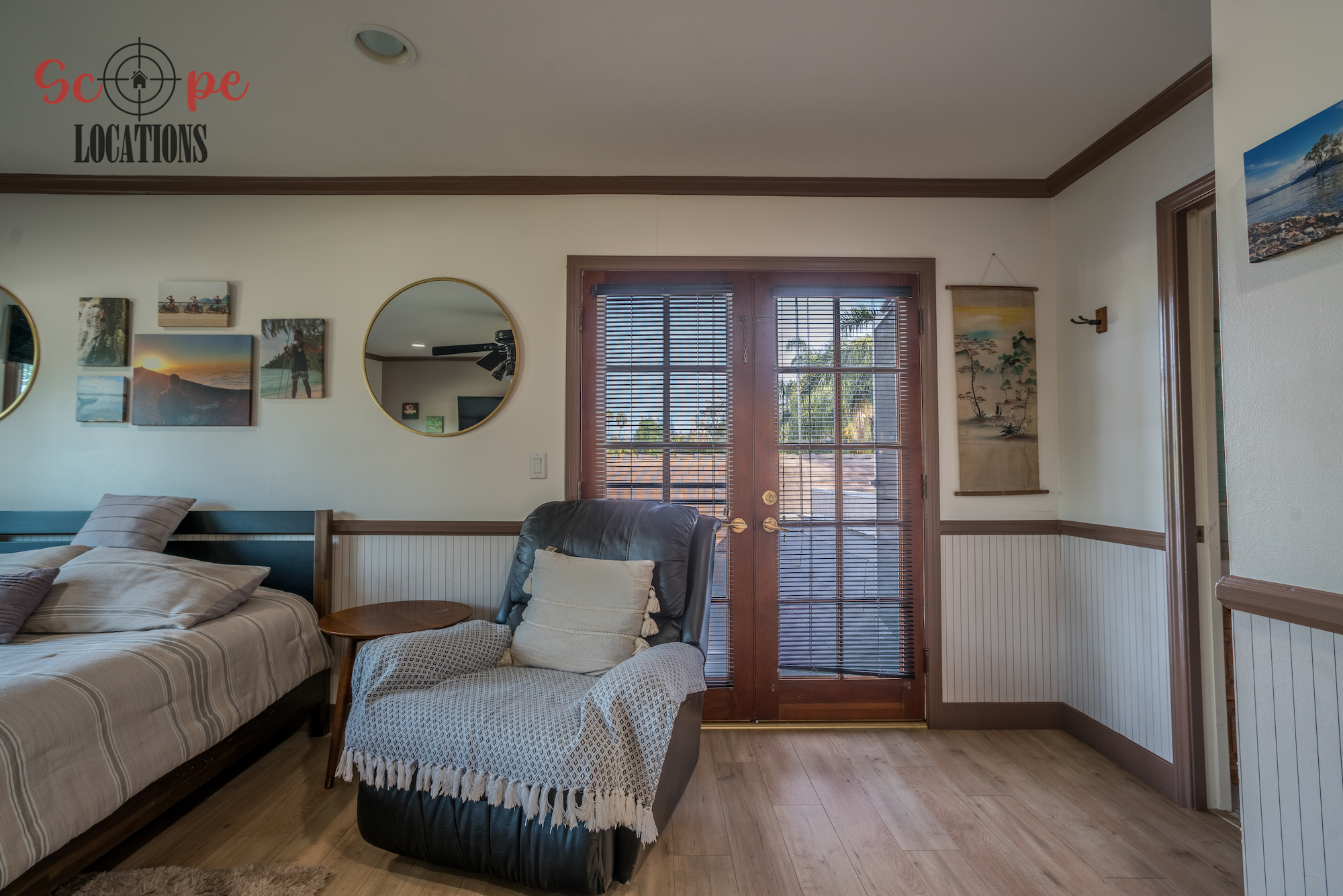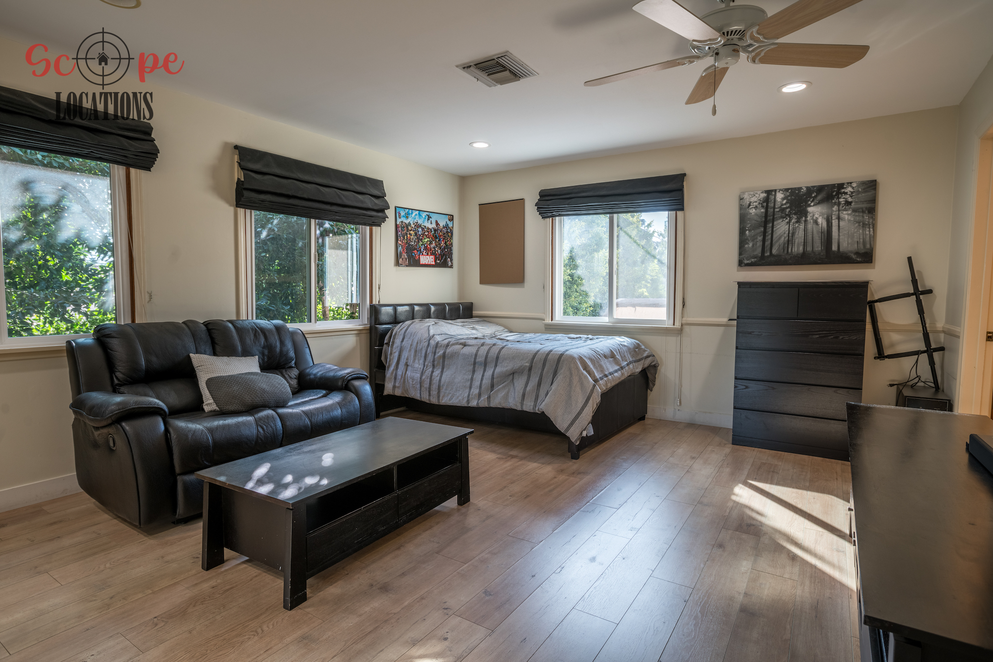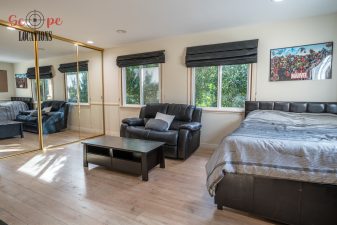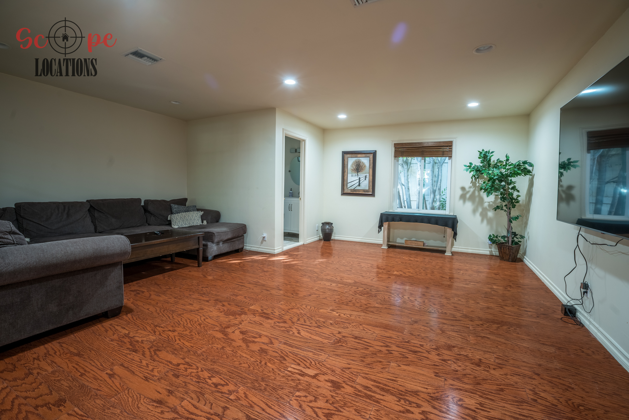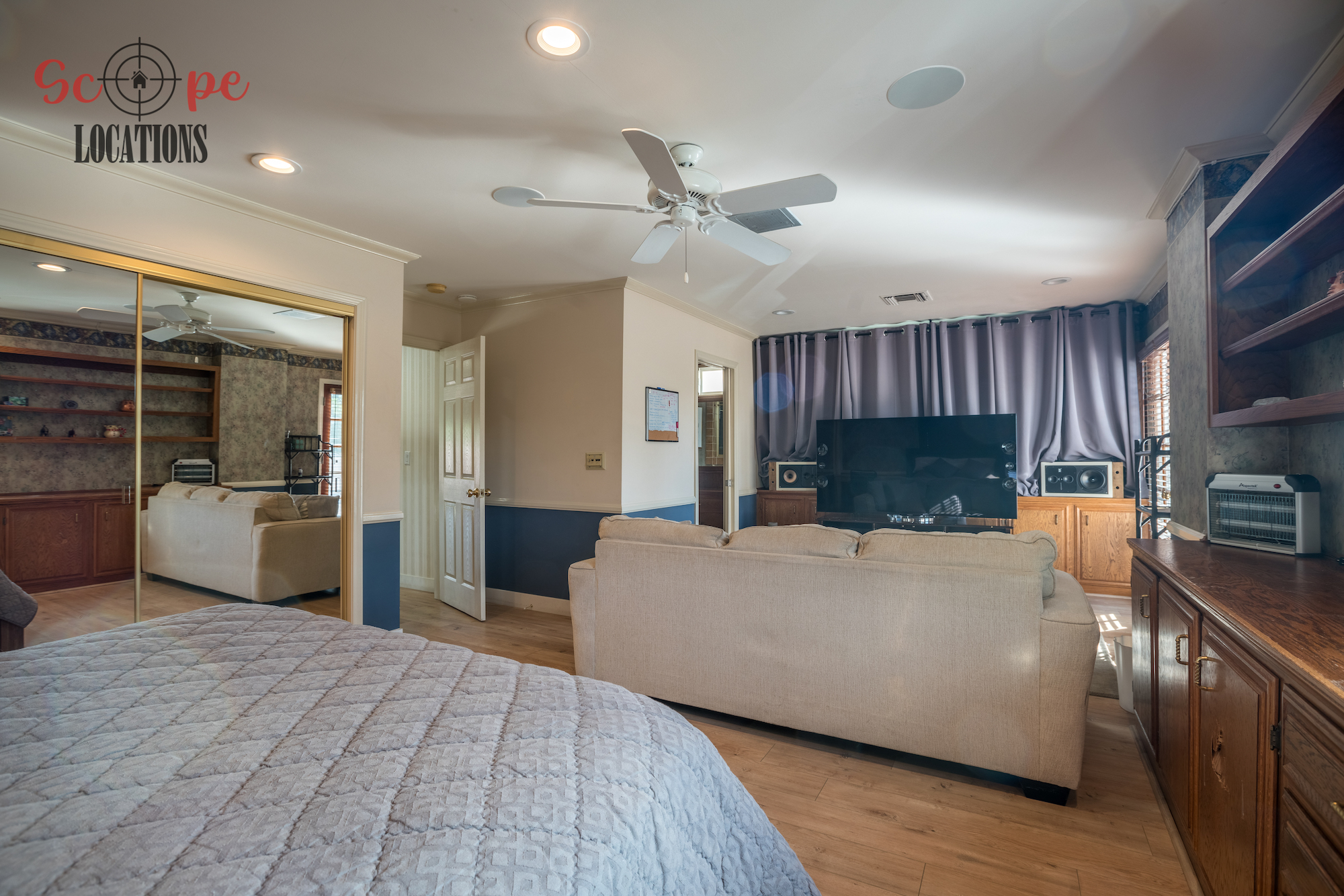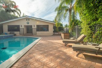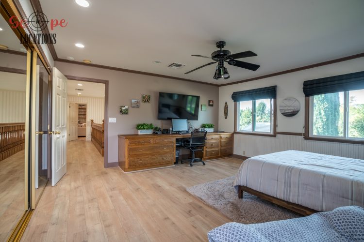 The outdoor space is a filmmaker’s haven, offering a brand-new covered built-in BBQ and kitchen, a resort-like pool, a separate guest house, a driveway with parking for over a dozen vehicles, and a wrap-around trellis. An adjacent lot with a small home adds further flexibility to meet your filming needs, making this location an epitome of versatility and grandeur.