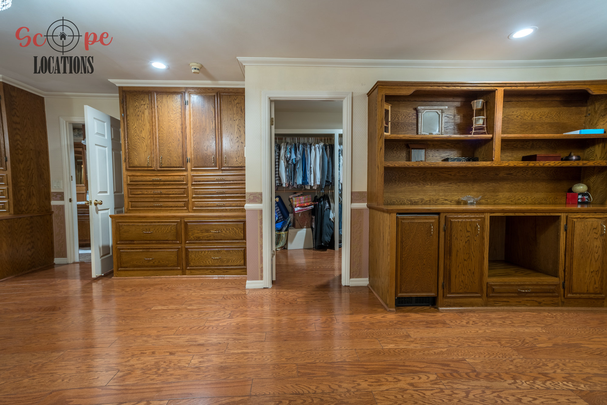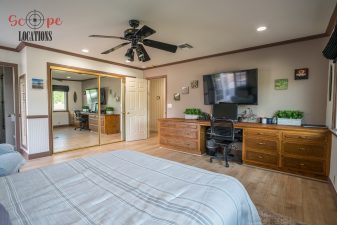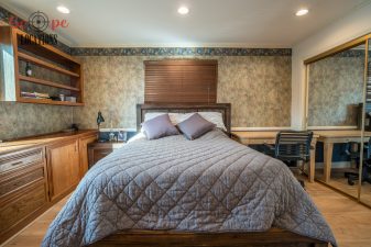 Explore down the hallway to find a wall of cabinet doors, concealing a secret walk-in pantry—an intriguing and versatile space. The main floor hosts a grand master bedroom with hardwood floors, built-in cabinets, crystal chandeliers, and a spacious walk-in closet. The master bathroom stands out with its remarkable features. At its heart, you’ll discover dual sinks facing each other, surrounded by wooden paneling on the walls and framed mirrors throughout. An alcove tub, set within a wooden frame, graces one side, while a separate shower stands opposite to the tub.
